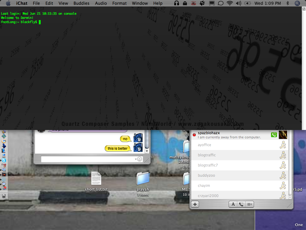 If you use the terminal often, this is indispensable. Not only does it take on whatever color scheme you have set for your terminal, it supports Quartz animations in the background. You really have to try it to see how cool it is.